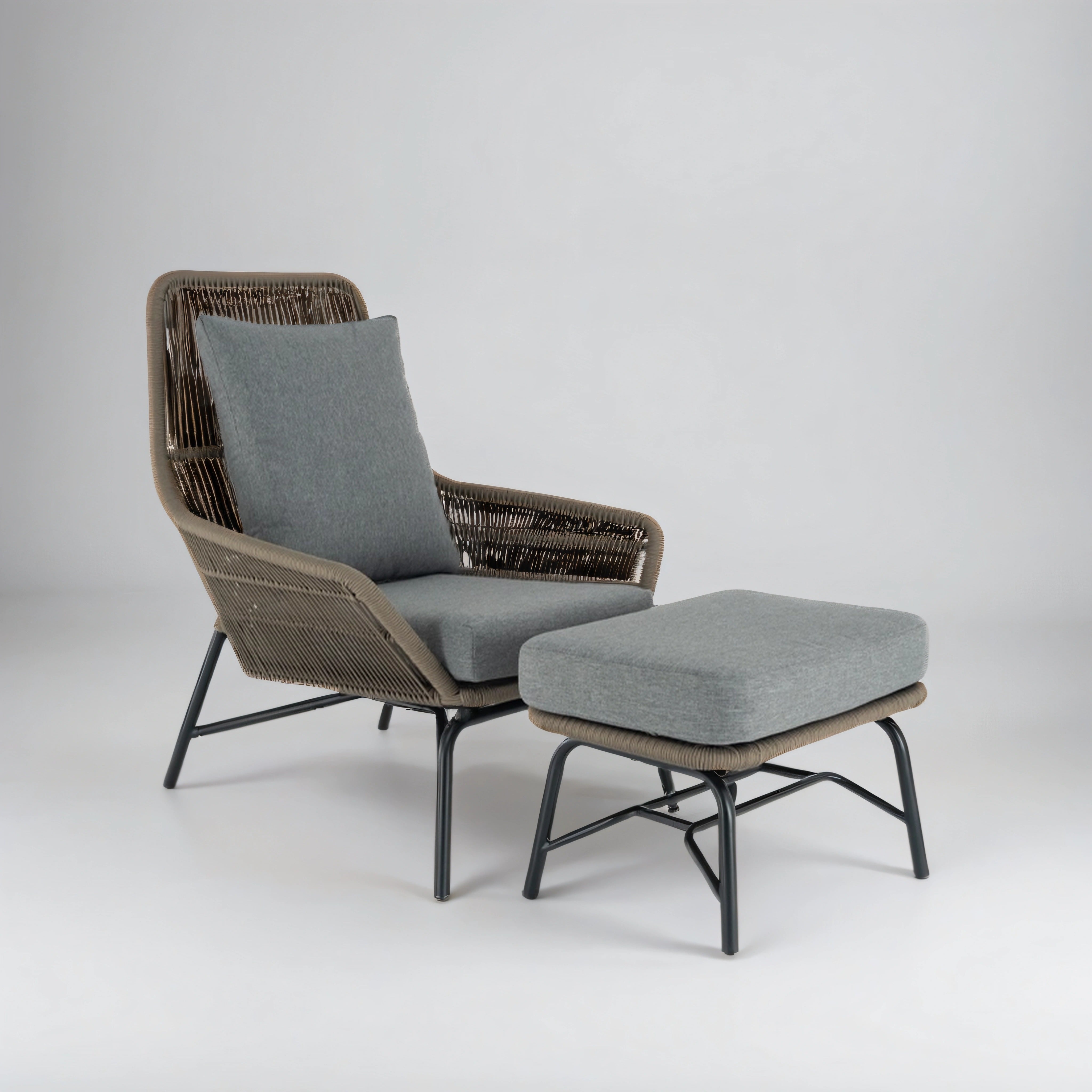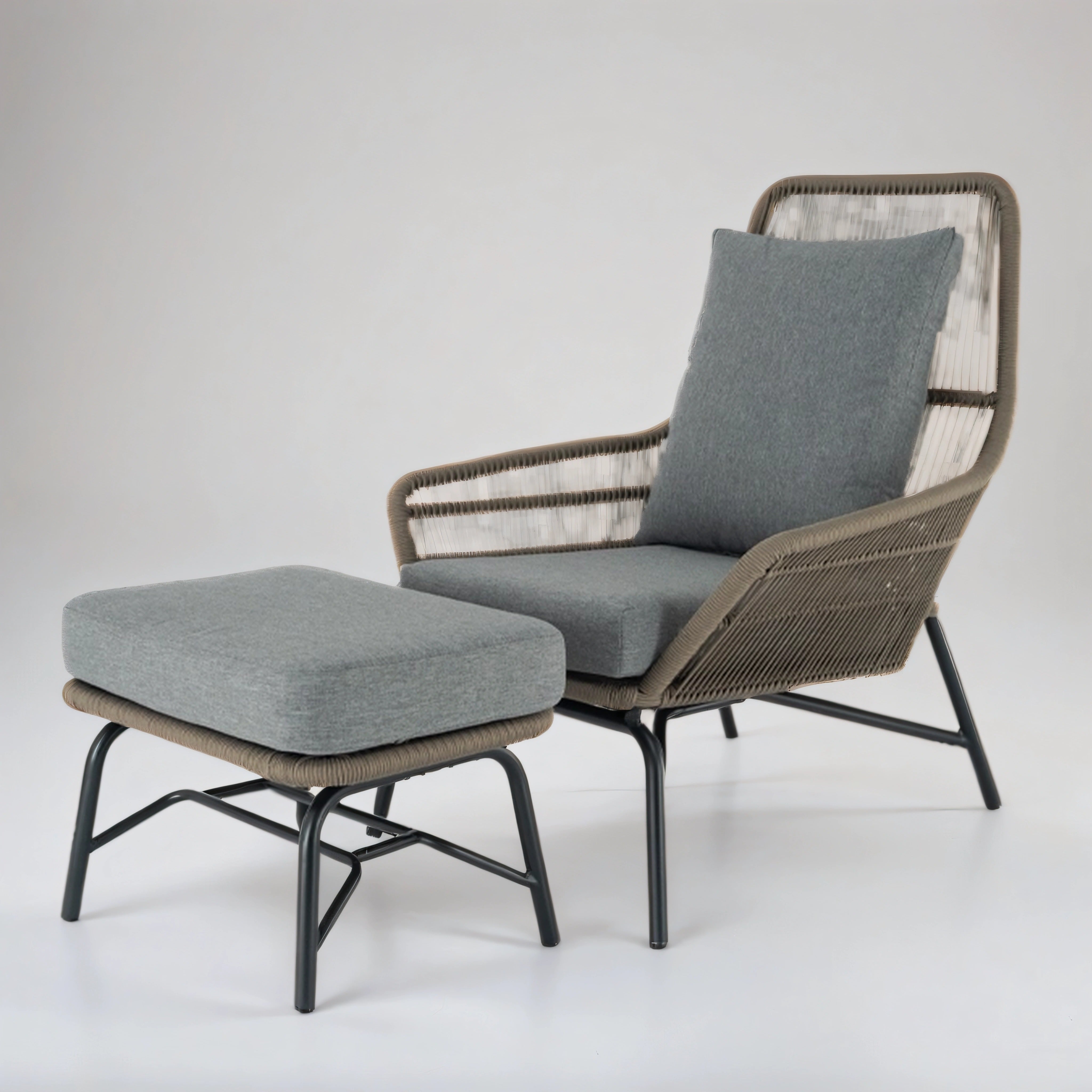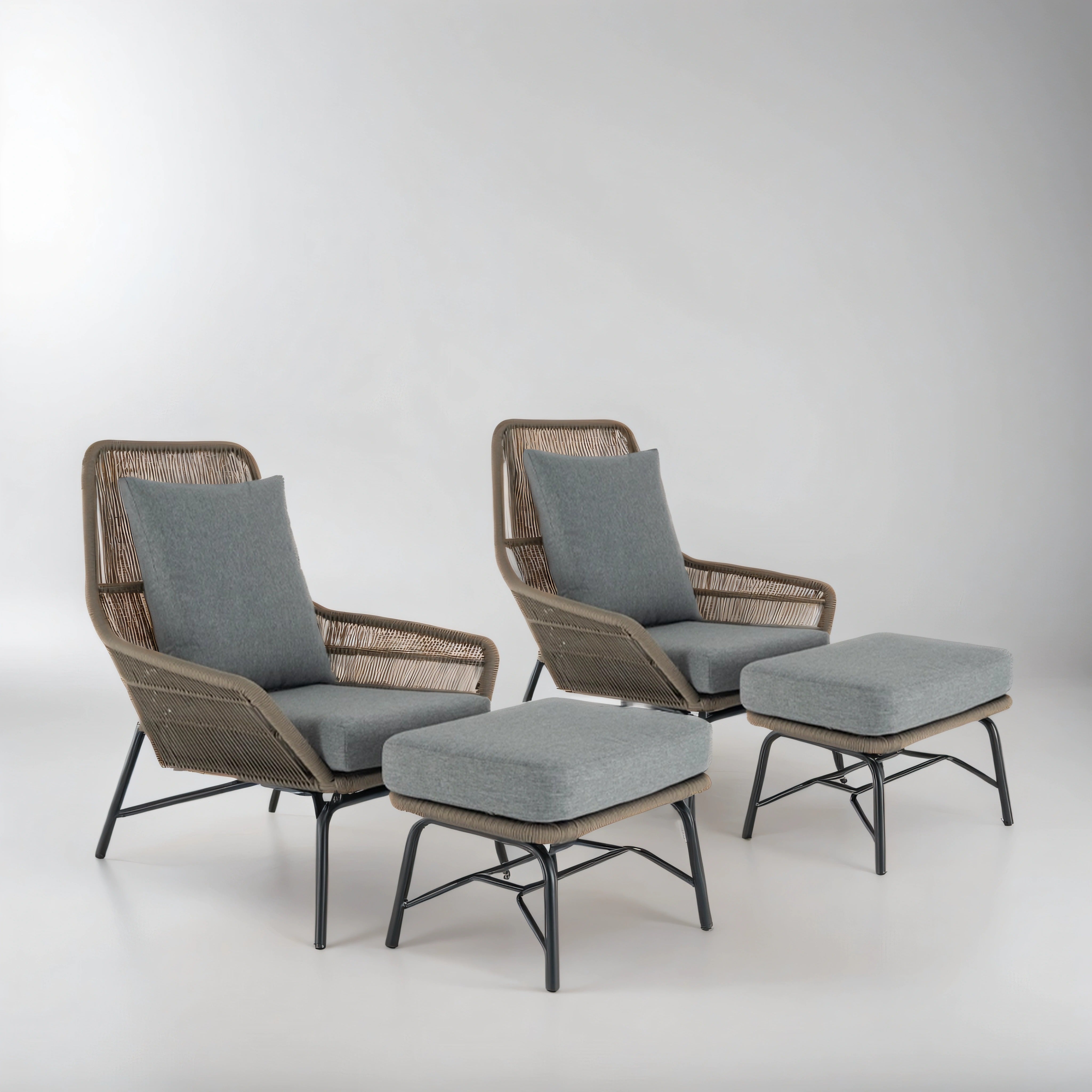 Enhance your patio relaxation with our Set of Two Gray Armchairs accompanied by Footrests. Designed for ultimate comfort, these stylish armchairs boast a soothing gray hue, bringing modern elegance to your outdoor space. The addition of footrests adds an extra layer of luxury, providing the perfect spot to kick back and unwind. Elevate your patio experience with this chic and comfortable ensemble.DIMENSIONS:Chair 34"W * 31"D * 39"HFootrest 16 "W * 31"D