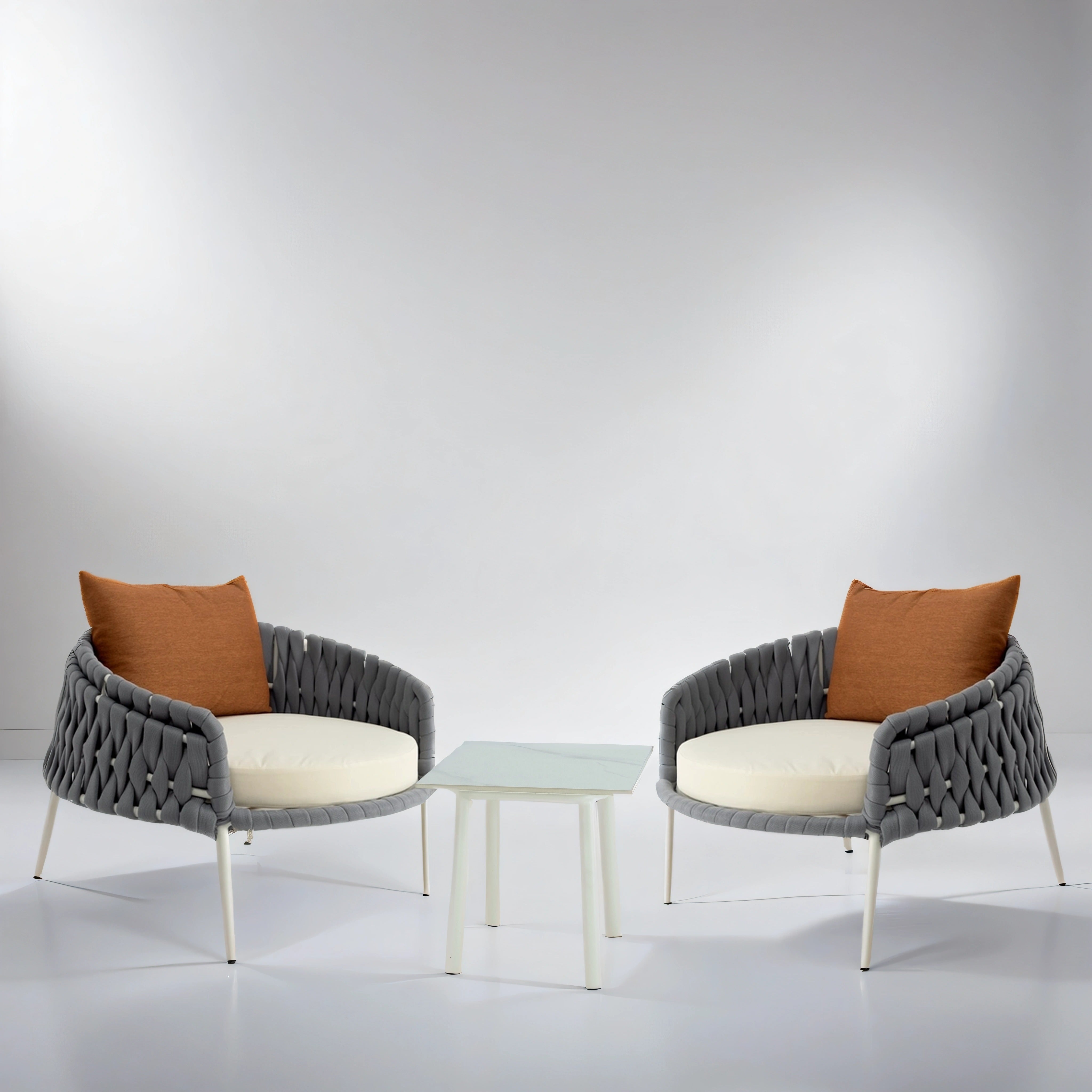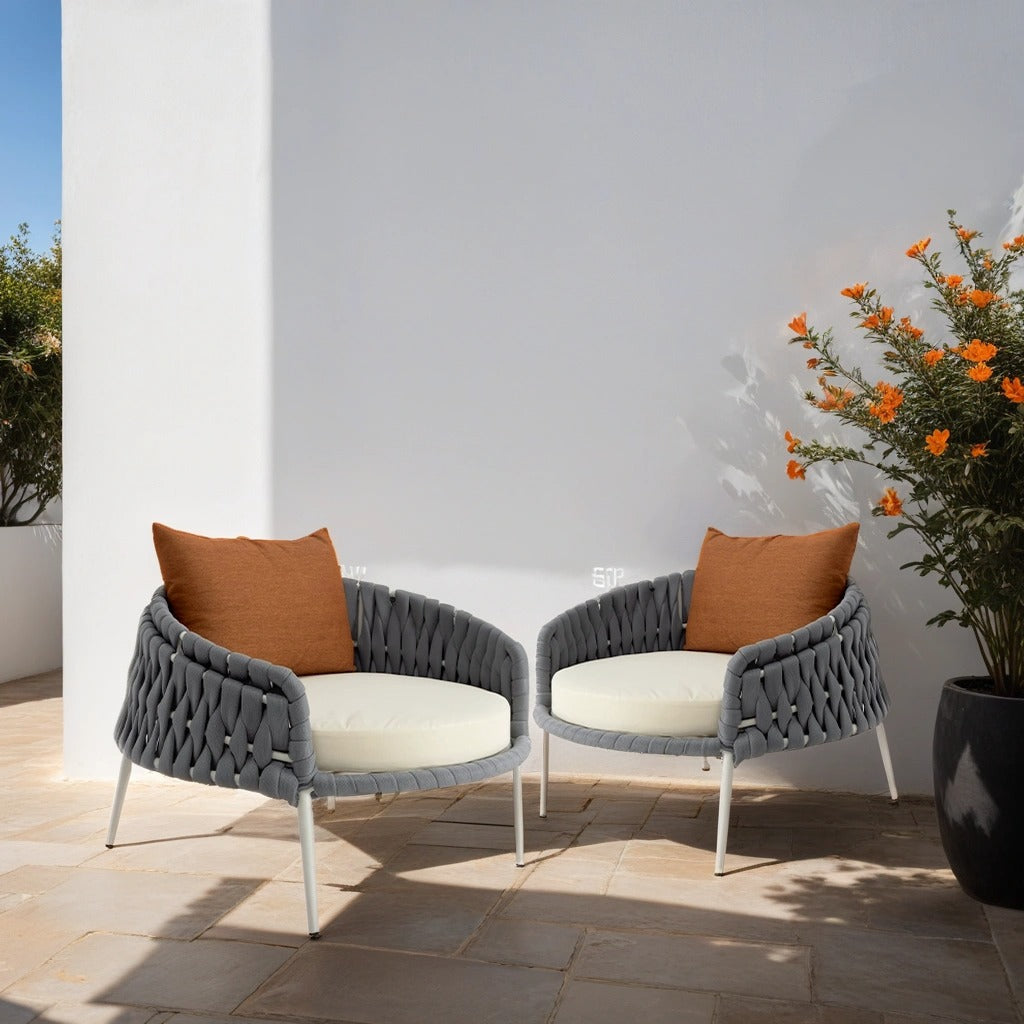 Elevate your patio with our Set of Two Round Aluminium Webbing Chairs accompanied by a stylish table. Crafted for both durability and aesthetics, these chairs feature a modern design with aluminum frames and intricate webbing details. The included table complements the ensemble, providing a perfect spot for your outdoor essentials. Enjoy the perfect blend of style and comfort in your backyard.DIMENSIONS:Armchair 35"W * 35"D * 25.5"HTable 16"W * 16"D * 16"H